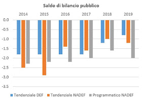 Onestamente, non sappiamo che cosa avrebbe fatto il PD se fosse rimasto al potere. Se dobbiamo imparare dal passato, forse avrebbe fatto uno 0.8+0.4=1.2 di deficit. Per scrupolo aggiungo che se il confronto fra tendenziale DEF e programmatico NADEF ha un senso quest’anno (per il semplice motivo che noi il DEF l’abbiamo ereditato), l’entità della manovra va correttamente valutata confrontando il tendenziale NADEF (aggiornato rispetto a quello DEF) con il programmatico NADEF. Il confronto lo trovate qui: