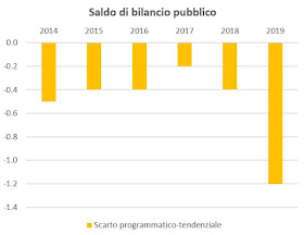 Il DEF del quale sono stato relatore prevedeva un tendenziale di 0.8 (non so se ve lo ricordate). Ora siamo finiti al 2, cioè a -1.2 di deficit addizionale. Fra il 2014 e il 2018 lo scarto fra tendenziale DEF e programmatico NADEF è stato in media di -0.4. Nel 2019, dopo la “ritirata” del Governo, è tre volte tanto.