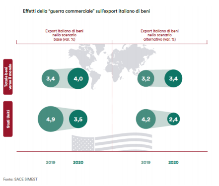 In caso di una simile escalation, le esportazioni italiane di beni verso il mondo aumenterebbero più lentamente (-0,2 punti percentuali nel 2019 e -0,6 p.p nel 2020), con impatti ancora più marcati per le nostre vendite verso gli Stati Uniti (-0,7 p.p. nel 2019, -1,1 p.p. nel 2020).