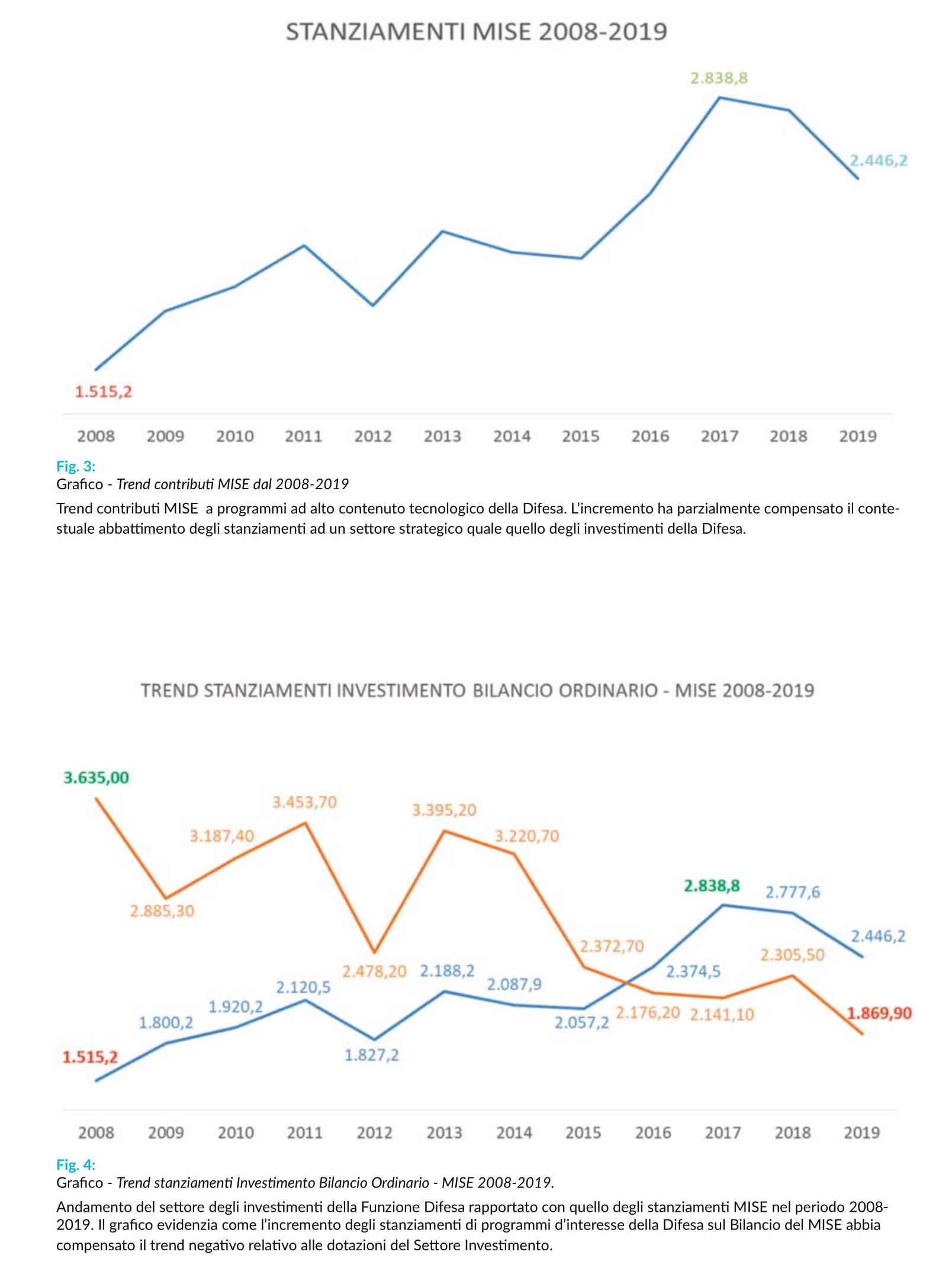 - i contributi beneficiati dalla Difesa tramite il finanziamento di selezionati programmi ad alto contenuto tecnologico da parte del Mi.S.E. (figura 3) hanno riportato un importante incremento pari a circa il 61%, passando da un importo di 1.515,2 M€ del 2008 ad un valore di 2.446,2 M€ del 2019, che ha consentito di compensare, sebbene parzialmente, il contestuale decremento sul settore degli investimenti della Difesa.