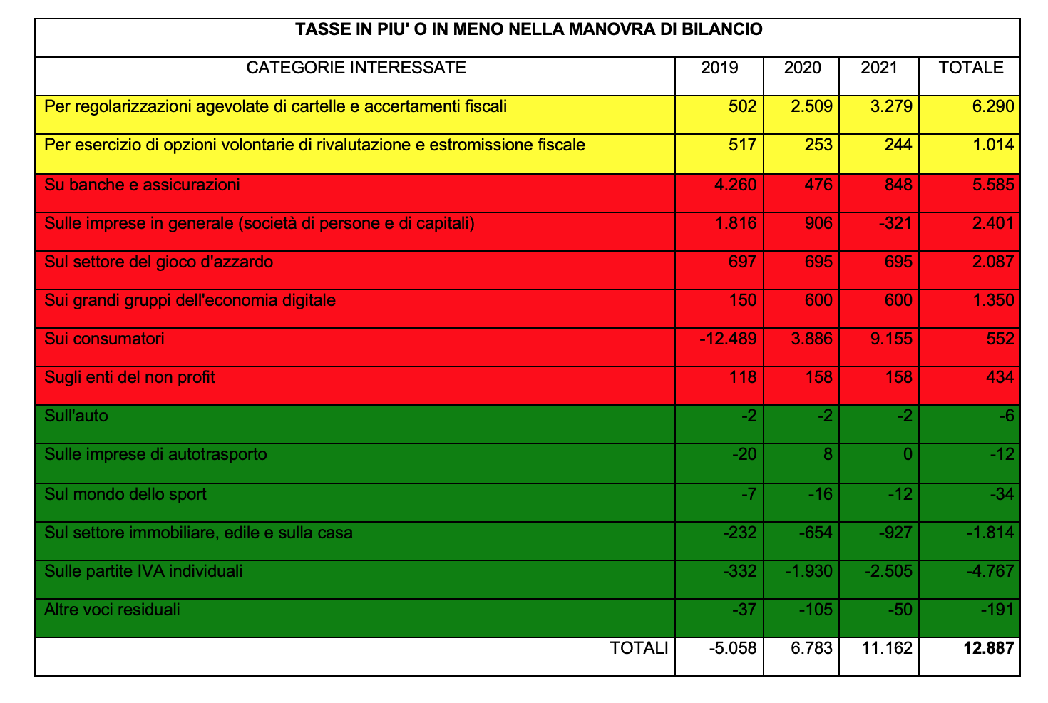 – 12,4 miliardi saranno invece le vere e proprie maggiori tasse applicate su banche e assicurazioni (5,6 miliardi), sulle imprese in generale (2,4 miliardi), sul settore del gioco d’azzardo (2,1 miliardi), sui grandi gruppi dell’economia digitale (1,3 miliardi), sui consumatori (0,6 miliardi) e sugli enti del non profit (0,4 miliardi);