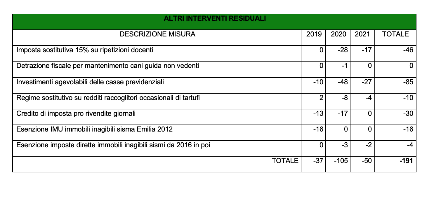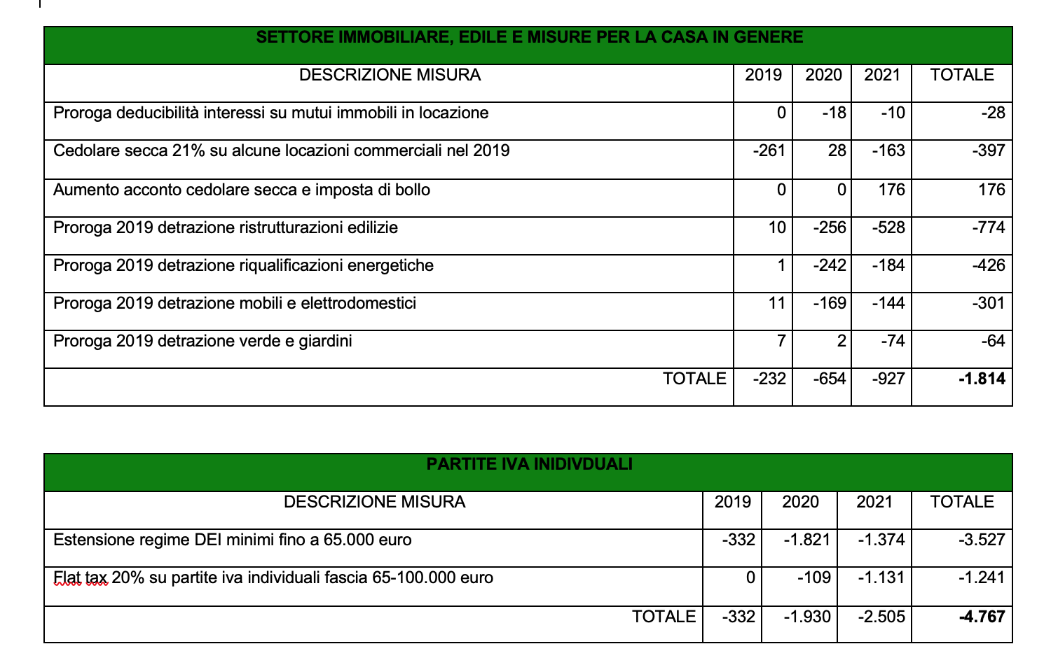 -6,8 miliardi saranno infine le note positive di riduzione del prelievo fiscale, concentrate essenzialmente sulle partite IVA individuali (- 4,8 miliardi) e sul settore immobiliare, dell’edilizia e degli interventi sulla casa in generale (- 1,8 miliardi), cui si aggiungono alcuni altri interventi marginali (- 0,2 miliardi).