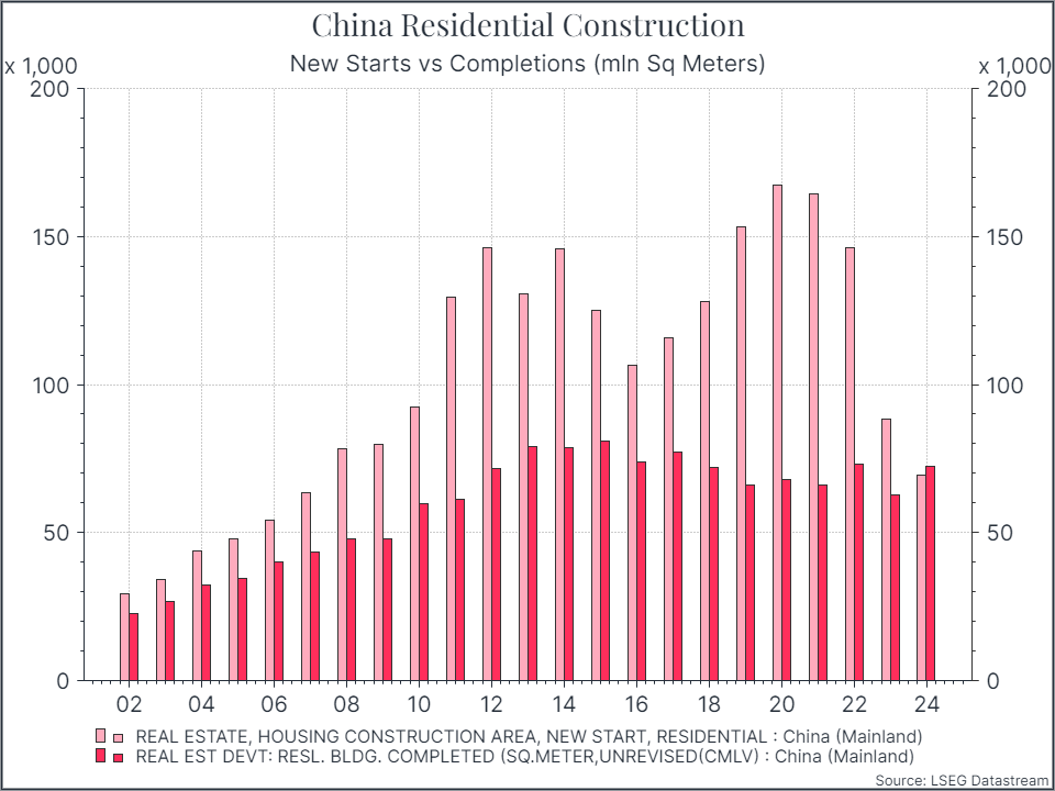 Nel corso dell’ultimo anno, l’economia cinese si è mostrata più debole del previsto e neppure le riaperture del post-Covid sono riuscite a rappresentare un significativo volano per la crescita. In questo contesto, la crisi del mercato immobiliare ha sicuramente giocato un ruolo decisivo: molti operatori hanno dovuto fronteggiare difficoltà finanziarie e il numero di nuovi cantieri residenziali aperti in territorio cinese è calato drasticamente (vedi grafico sotto).