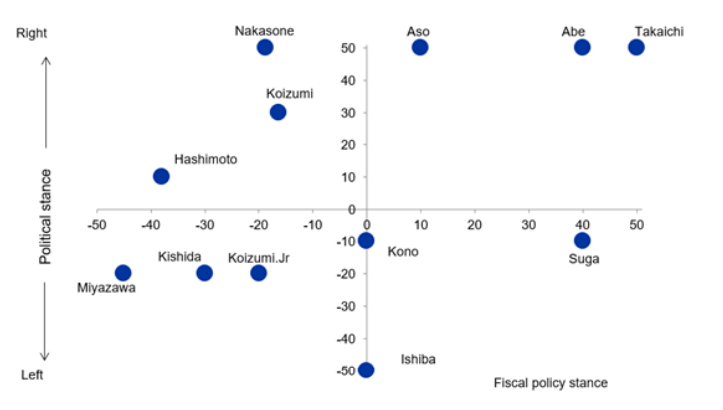 L’ex ministro degli interni Sanae Takaichi appoggia una politica economica molto simile a quella dell’”Abenomics”, che prevede una combinazione di allentamento monetario aggressivo, uso di risorse fiscali nelle emergenze e spesa per la gestione della crisi e per la crescita. In un’intervista Takaichi ha dichiarato che il Giappone dovrebbe congelare l’obiettivo di portare il bilancio in pareggio fino a quando l’inflazione non raggiungerà il target del 2% della BoJ, e che non dovrebbe esitare a emettere titoli di Stato se necessario per gestire più efficacemente la crisi. Se diventasse il nuovo primo ministro, lo stimolo fiscale sarebbe di entità superiore a quello degli altri contendenti.