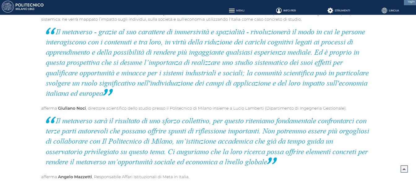 Già allora Noci si lasciava andare a commenti entusiastici che certo non si sposano troppo con la terzietà del Politecnico rispetto allo studio: “Il metaverso – grazie al suo carattere di immersività e spazialità – rivoluzionerà il modo in cui le persone interagiscono con i contenuti e tra loro, in virtù della riduzione dei carichi cognitivi legati ai processi di apprendimento e della possibilità di rendere più ingaggiante qualsiasi esperienza mediale”. Questo il passaggio riportato, ancora oggi a caratteri cubitali, sul sito del PoliMi (subito sotto la quote integrale).