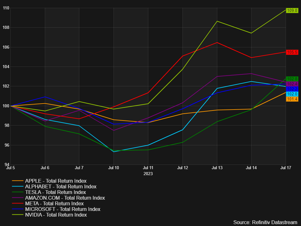 Se da una parte questo ribilanciamento speciale potrebbe avere delle ripercussioni sulle Big Tech – ricordiamo che nei giorni successivi all’annuncio Apple ha perso l’1,1%, Alphabet e Amazon oltre il 2%, Microsoft e Tesla oltre l’1% – dall’altra non si può fare a meno di notare che le Sette si sono riprese nel giro di 10 giorni. L’impatto sui mercati non sembra quindi essere stato profondo, come risulta anche dal grafico sotto, che mostra il ritorno totale di chi ha investito in queste società tra il 5 e il 17 luglio.