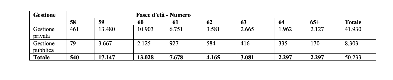 È lo stesso problema emerso per quota 100: i due requisiti, quello anagrafico e quello contributivo, non procedono di pari passo, per cui capita che una donna a 58 anni non abbia ancora raggiunto i 35 anni di versamenti o viceversa. Come si vede dalla sottostante tabella lo stock più elevato riguarda i soggetti compresi tra 59 e 60 anni, ma non sono pochi anche quelli con età superiori.