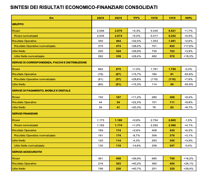 Corrispondenza, pacchi e distribuzione: ricavi pari a € 875 milioni (+1,5% rispetto al secondo trimestre del 2018); ricavi da attività di recapito pacchi in aumento del 12%, con il comparto B2C in rialzo del 22,6%; i ricavi da corrispondenza in ribasso dell’1,5%, caratterizzati da un recupero nel secondo trimestre dell’anno e dall’effetto di re-pricing a luglio 2018; risultato operativo pari a -€ 67 milioni, in miglioramento del 15,7% (il risultato operativo normalizzato è migliorato del 29,6%, a -€ 57 milioni)