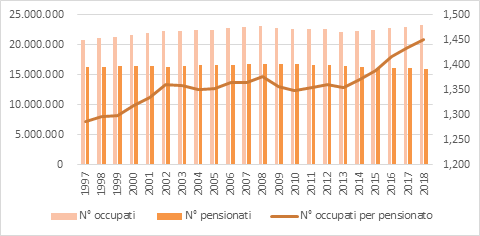 Figura 1 – Numero di occupati, pensionati e rapporto occupati/pensionati