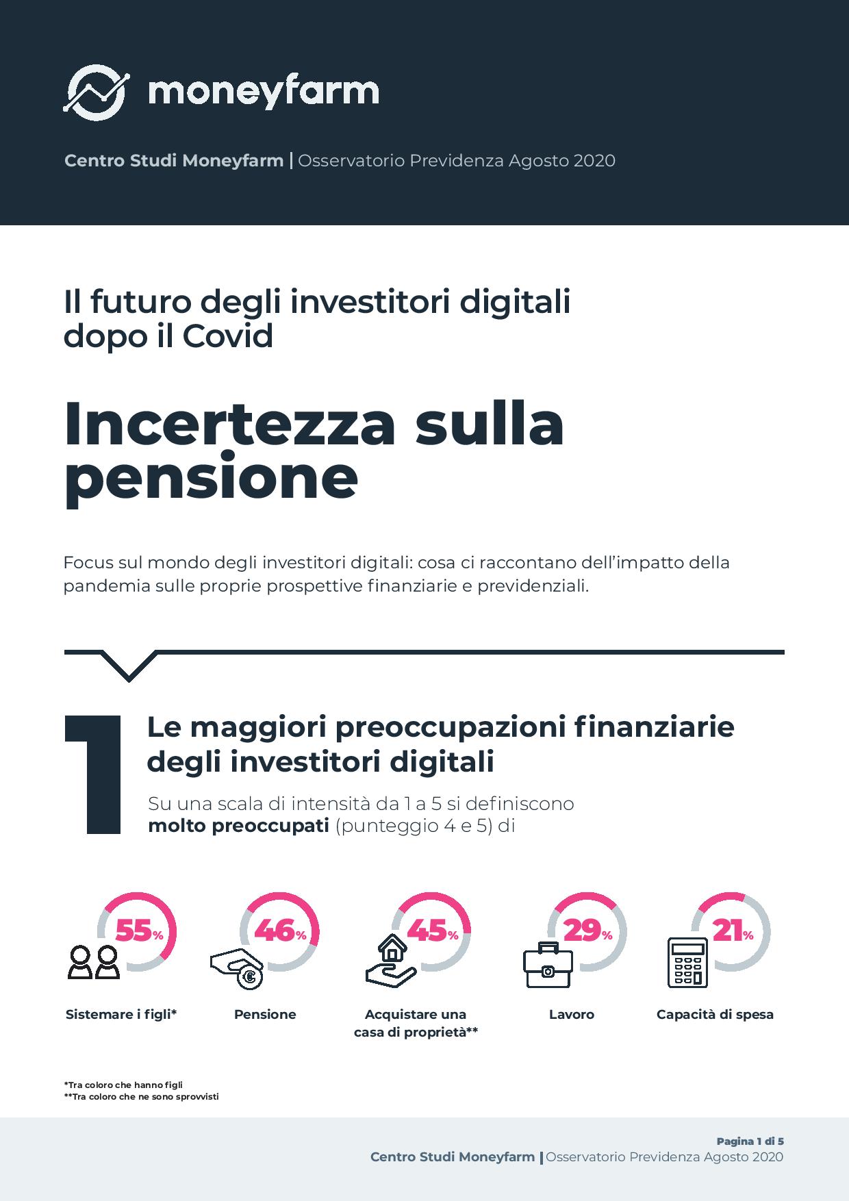 Sono tanti gli interrogativi che gli investitori si pongono dall’insorgere dell’emergenza Covid: da quali siano le scelte di investimento più oculate o vincenti a quali siano le prospettive per il proprio futuro finanziario. Se l’investitore digitale appare sicuramente più evoluto, c’è ancora un nodo da sciogliere che crea non poche incertezze, a tutti i livelli: la pensione. È quanto emerge da un sondaggio condotto da Moneyfarm, società di gestione del risparmio con approccio digitale, su un campione di circa 1.380 investitori residenti in Italia (estratto dal database di clienti e utenti Moneyfarm – circa 200 mila individui – tra le persone con almeno un piano di investimento attivo) che ha fotografato l’impatto della pandemia sulle prospettive degli investitori digitali.