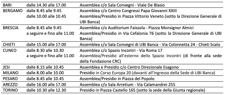 Nelle 8 piazze in cui hanno sede gli uffici oggetto di cessione (Bari, Bergamo, Brescia, Chieti, Cuneo, Jesi, Milano e Pesaro) le organizzazioni sindacali hanno organizzato assemblee e presidi che hanno anche l’obiettivo di accendere i riflettori sul rischio che a questa operazione ne possano seguire altre.