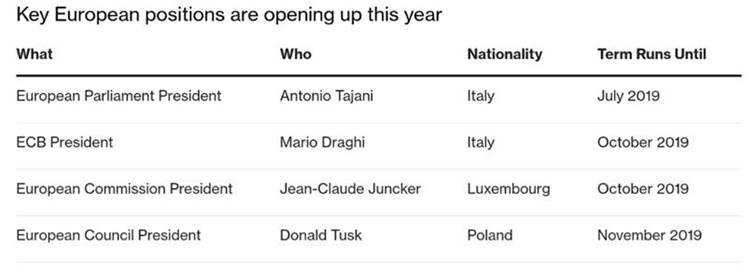 A tal proposito da segnalare che le indiscrezioni di stampa segnalano che il successore alla presidenza BCE potrebbe essere designato solo poche settimane prima della scadenza del mandato a ottobre, a causa di forti divergenze di opinioni sul tema. L’indicazione del successore avverrebbe dopo quella del presidente della Commissione Europea, anch’essa in scadenza a ottobre 2019.