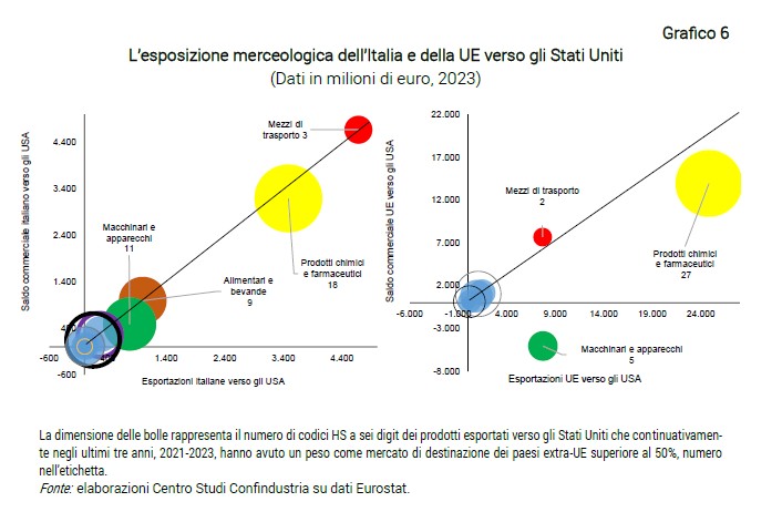 I prodotti europei che soddisfano lo stesso criterio di selezione sono in numero inferiore a quelli italiani, 81 su quasi 5mila prodotti esportati negli USA. Per questi prodotti le vendite negli USA rappresentano il 67% di quelle extra-UE, nel 2023 hanno superato complessivamente i 45 miliardi di euro, il 9,1% del totale esportato nel mercato americano e contribuiscono al 14% del surplus commerciale.