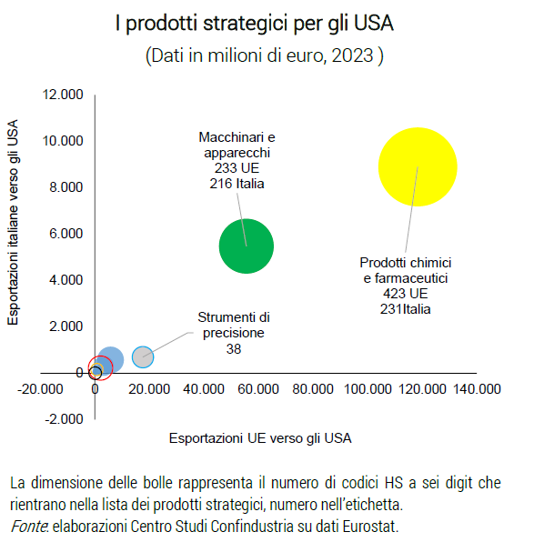 I prodotti strategici italiani destinati agli Stati Uniti rappresentano più di un quinto del totale dell’export italiano negli USA (17 miliardi di euro nel 2023). Un peso superiore hanno quelli venduti dall’insieme dei paesi europei, pari al 40% del totale dell’export negli USA (più di 200 miliardi di euro). L’insieme di questi prodotti ha generato un surplus commerciale sia per l’Italia, di circa 4 miliardi, che per la UE, poco più di 36 miliardi.