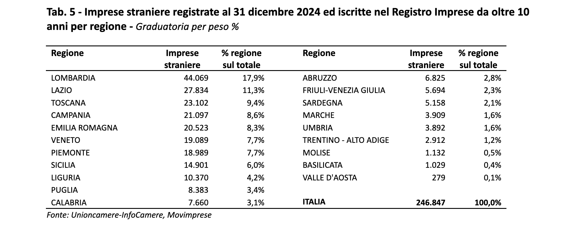 La Lombardia guida la classifica delle regioni con 44.069 imprese straniere di lungo corso (17,9%), seguita da Lazio (27.834) e Toscana (23.102). Completano la top five Campania (21.097) ed Emilia-Romagna (20.523), delineando una presenza distribuita che abbraccia Nord, Centro e Sud del Paese.