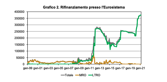 Nel mese di febbraio i finanziamenti forniti dalla Banca d’Italia alle banche sono rimasti stabili rispetto al mese precedente, attestandosi a 373,9 miliardi di euro (215,4 a febbraio 2020), lievemente al di sotto del massimo storico della serie. L’ammontare dei fondi presi a prestito con le aste a lungo termine è diminuito di 0,1 miliardi, segnando 373,7 miliardi. Al contempo, in aumento di 100 milioni i fondi attinti attraverso le MRO (Main Refinancing Operations), pari a 0,1 miliardi. Le MRO continuano a segnare un valore estremamente ridotto, confermando una situazione di assoluta tranquillità per la liquidità bancaria. Considerando che nel corso del 2021 si terranno nuove aste a costi particolarmente vantaggiosi per le banche, è possibile che si registrino ulteriori aumenti dei fondi presi a prestito dalla BCE. Il grafico 2 riassume queste dinamiche visualizzando l’andamento del totale delle operazioni di rifinanziamento e delle sue componenti: le operazioni di rifinanziamento principali (Main Refinancing Operations) e le operazioni di rifinanziamento a più lungo termine (Long Term Refinancing Operations).