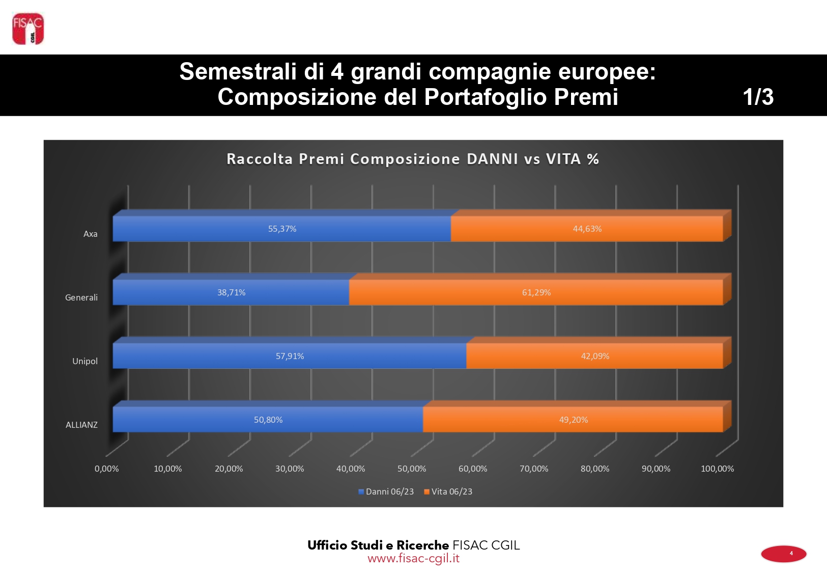 A giugno scorso i quattro gruppi hanno messo a segno premi per un totale di 186,7 miliardi di cui quasi 93 miliardi nel ramo danni (+8,73%) danni e quasi 94 nel vita (+0,30%). In particolare per Axa il 55,37% afferisce al danni con 30,4 miliardi (+5,92% su anno) e il restante al vita con 24,5 miliardi (-3,16%). In linea Unipol (57,91% danni) ma con cifre ben diverse: rispettivamente premi per 4,3 miliardi (+4,17%) e per oltre 3,1 miliardi (+26,77%). La performance maggiore la mette a segno Allianz con una divisione più o meno a metà: 41,7 miliardi (+9,78%) dal ramo danni e 40,4 miliardi dal vita (+1,26%). Infine, Generali rovescia la proporzione visto che il 38,71% dei premi li raccoglie nel ramo vita (quasi 26 miliardi, -0,32%) e oltre 16,3 miliardi (+12,85%) dal ramo danni.