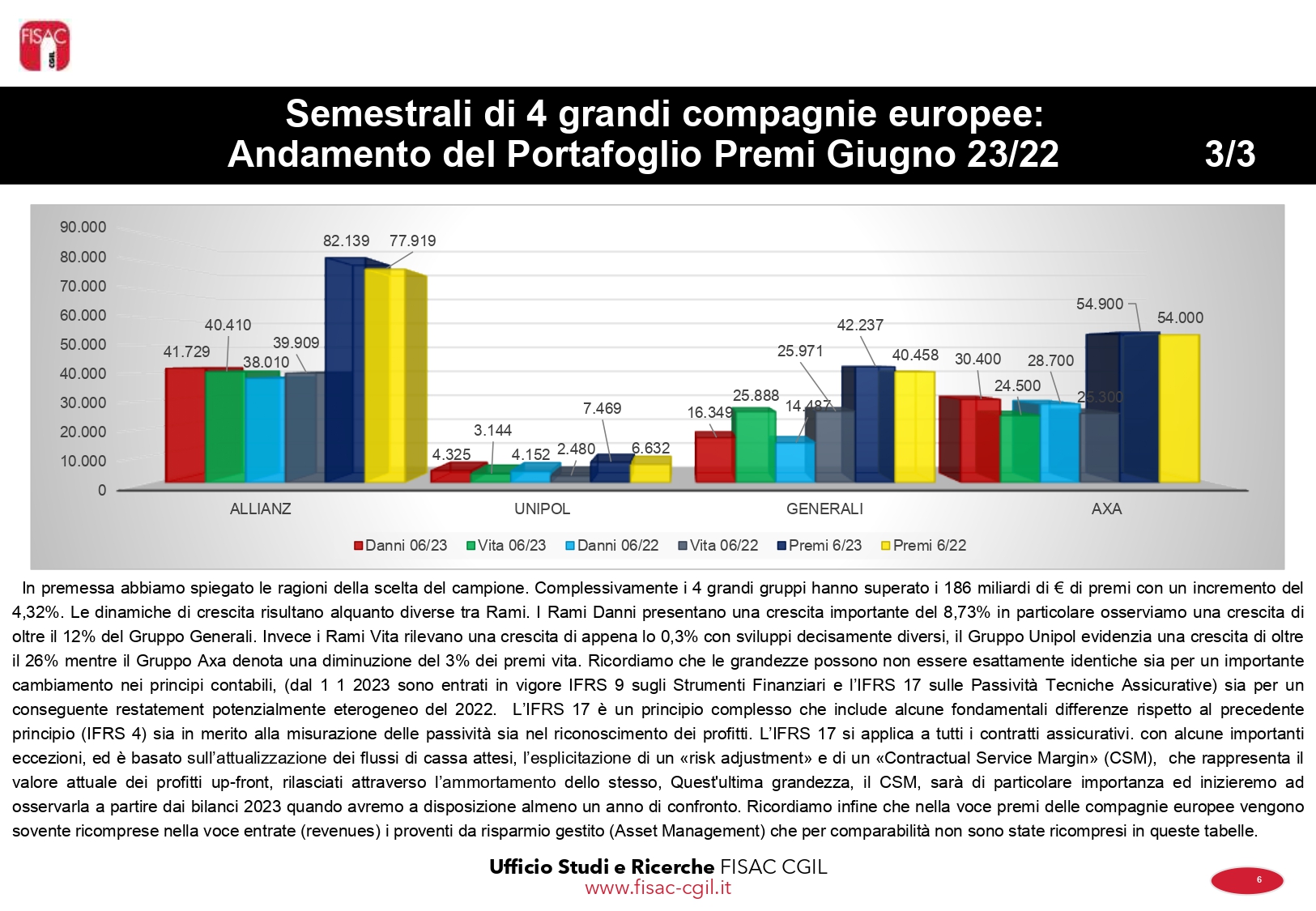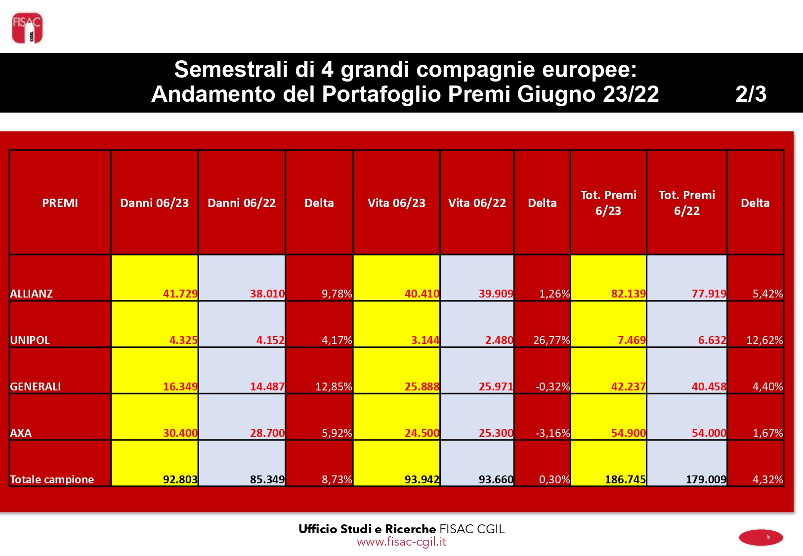 per oltre 11,3 miliardi, è Allianz a far segnare i maggiori introiti con 4,6 miliardi (+73,72%), seguita da Axa 3,83 miliardi (-0,49%), da Generali 2,33 miliardi (+60,91%) e da Unipol 517 milioni (+19,40%). “Il settore ha manifestato, nel campione selezionato, una importante resilienza – si legge nel report – ed anche con riguardo al campione italiano costituito dal gruppo Generali e Gruppo Unipol vi è stato un importante incremento. Si rileva infine, nel complesso, un incremento significativo di Allianz mentre Axa conferma sostanzialmente l’utile del semestre 2022”.
