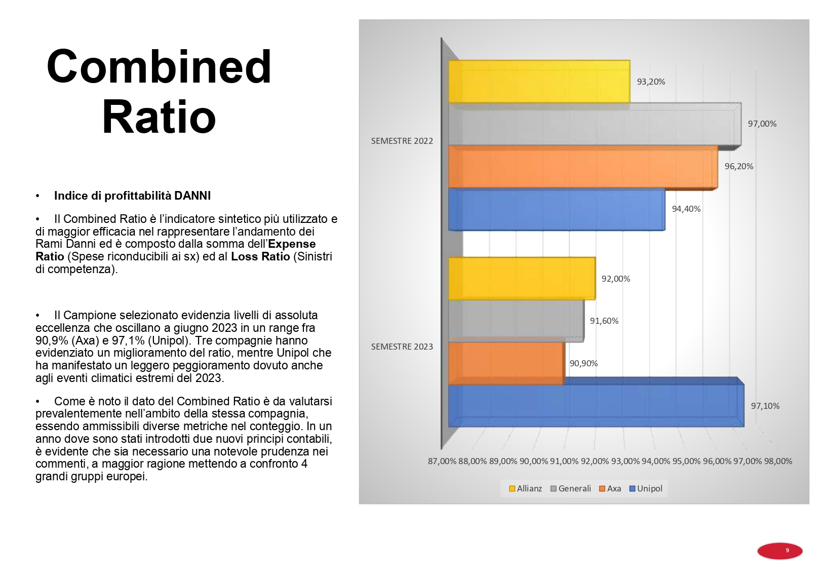 Il report Fisac prende in esame anche il combined ratio delle compagnie e si notano “livelli di assoluta eccellenza che oscillano a giugno 2023 in un range tra 90,9% (Axa) e 97,1% (Unipol)” passando per 91,6% di Generali e 92% di Allianz. Ulteriore sottolineatura: Allianz, Axa e Generali mostrano un miglioramento del ratio mentre Unipol un leggero peggioramento dovuto anche agli eventi climatici estremi del 2023, a partire dall’alluvione in Emilia Romagna.