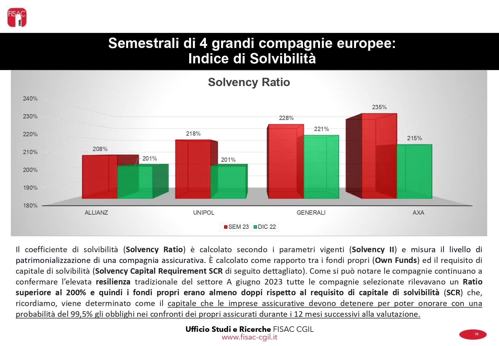Il settore assicurativo, si osserva infine nel report Fisac Cgil, si conferma nel complesso molto solido ed evidenza, inoltre, indici di solvibilità (Solvency Capital Requirement II – SCR Ratio) in deciso incremento. I gruppi presi in esame, infatti, hanno tutti ratio già superiori al 200% a dicembre 2022, quindi “con fondi propri più che doppi rispetto al requisito di capitale di solvibilità SCR (ossia il capitale che le imprese assicurative devono detenere per poter onorare con una probabilità del 9,5% gli obblighi nei confronti dei propri assicurati durante i 12 mevsi successivi alla valutazione), che è passato da una media del 210% a dicembre 2022 ad una del 222% a giugno 2023”, arrivando al 208% di Allianz, al 218% di Unipol, al 228% di Generali e, infine, al 235% di Axa.