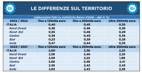 Rispetto alle condizioni di finanziamento esistenti a fine 2021, le famiglie più penalizzate dai ritocchi sui tassi, sono concentrate nelle aree del Paese meridionali e centrali (Lazio, Marche, Toscana e Umbria) dove i tassi hanno subìto incrementi più ampi: la variazione più rilevante, fra il 2021 e il 2023, si è registrata nelle regioni del Centro con uno spread di 251 punti e gli interessi arrivati al 4,16% medio, nelle Isole la variazione è stata di 248 punti e al Sud di 247.