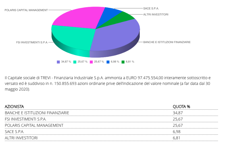 La capogruppo Trevi Finanziaria Industriale SpA è quotata alla borsa di Milano dal mese di luglio 1999. L’investimento del gruppo Cdp è stato effettuato attraverso il veicolo FSI Investimenti (controllato al 77,12% da Cdp Equity). Nel complesso il Gruppo Cdp detiene il 32,66% di Trevi Finanziaria Industriale SpA, in quanto Sace ne detiene il 6,99%.