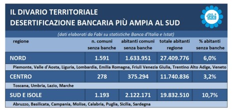 La mappa della rete italiana degli sportelli bancari restituisce la fotografia di una Italia a tre velocità. La desertificazione bancaria risulta molto accentuata nel Sud e nelle Isole, con il 10,7% della popolazione che vive in 1.193 comuni dove non sono presenti filiali di banche: