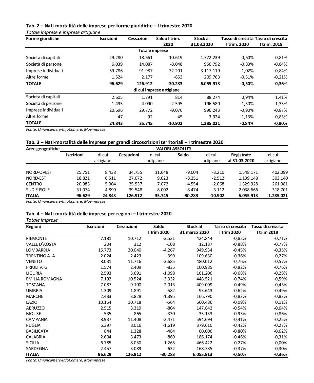 In netto calo sia le iscrizioni che, in misura minore, le cessazioni. Tra gennaio e marzo si registrano 96.629 nuove aperture, a fronte di 114.410 dello stesso trimestre dell’anno precedente, e 126.912 chiusure contro le 136.069 del 2019.