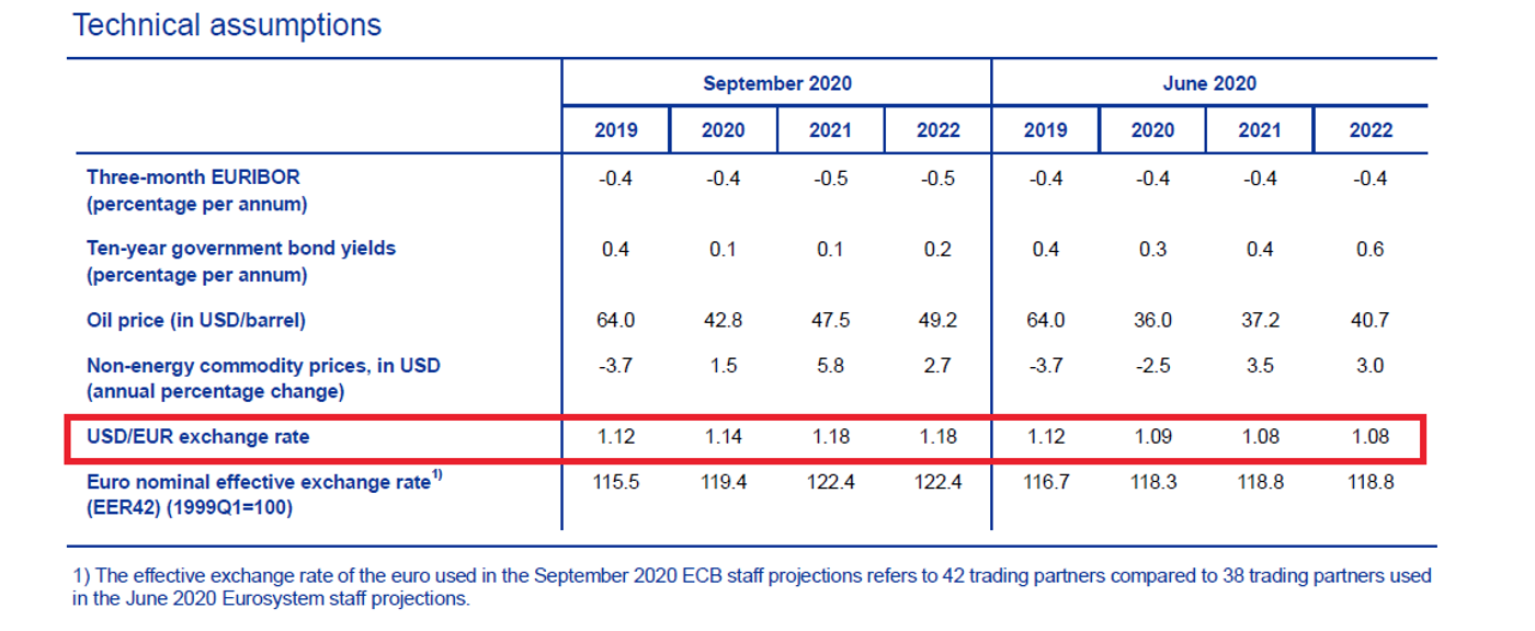 Interessanti le stime sul cambio (riportate nella seguente tabella) adottate dalla Bce per arrivare ad uno scenario di sostanziale invarianza sull’inflazione.