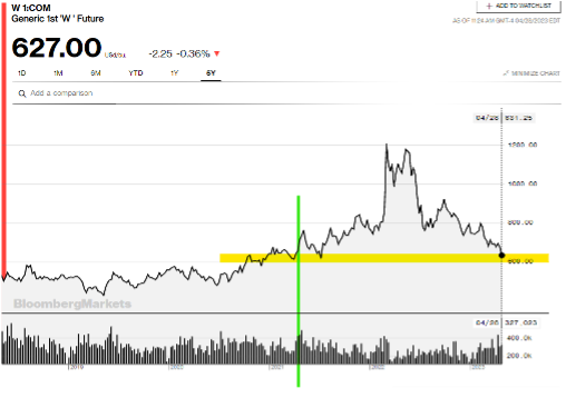 Ora siamo a fine aprile 2023 ed il prezzo medio del grano rilevato presso la borsa merci di Bologna (ma anche osservando il Cbot di Chicago il risultato non cambia) è sostanzialmente tornato ai livelli di fine luglio 2021, quando era appena partita l’impennata dei prezzi, ma il prezzo della pasta era ancora fermo.