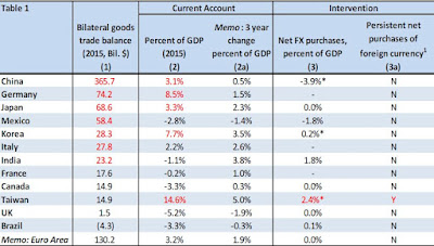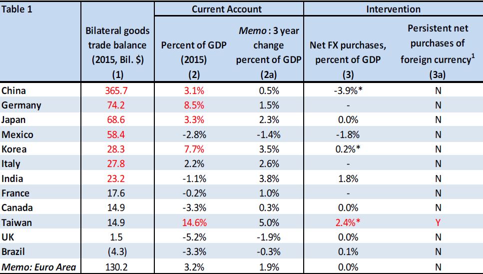 La prima reazione fu semplice: la revisione dell’Omnibus Foreign Trade and Competitiveness Act, una legge promulgata sotto la presidenza Reagan e poi rinnovata varie volte che conferiva al governo degli Stati Uniti il compito di sorvegliare l’evoluzione della competitività dei principali partner commerciali, e in particolare l’andamento delle loro valute. Con il Trade Facilitation and Trade Enforcement Act del 2015 si definivano dei precisi criteri quantitativi per l’individuazione dei paesi manipolatori di valuta e per quelli da mettere sotto osservazione. I criteri da considerare diventavano tre: entità del surplus della bilancia dei pagamenti (non superiore al 3%), entità del surplus bilaterale con gli Stati Uniti (non superiore a 20 miliardi di dollari), persistenza degli interventi sul mercato dei cambi. Il rapporto semestrale sulle Politiche Macroeconomiche e Valutarie dei Principali Partner Commerciali si arricchiva così di una nuova tabella, la lista dei paesi sotto osservazione, e naturalmente a partire dall’edizione dell’aprile 2016 (la prima a recepire le modifiche della normativa) la Germania, infrangendo due criteri su tre, veniva messa in lista, come qui sapete bene: