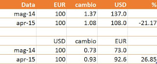 Come i miei lettori sanno, ogni tanto ci prendo, e infatti dopo il puntino rosso vedete un bello scivolone. Da 1.37 (media del mese di maggio 2014) l’euro scese a 1.08 (media del mese di aprile 2015). Soddisfazione intellettuale a parte (ci voleva poco), in pratica che cosa era successo?