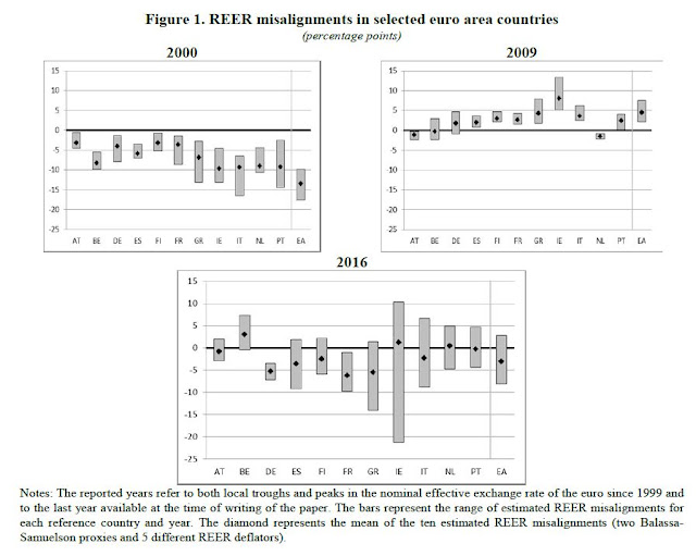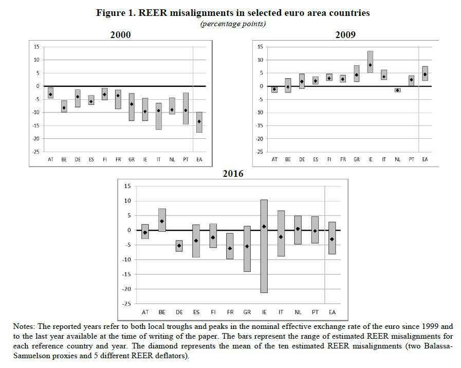 La metodologia usata ve la descrissi qui tre anni fa, i risultati sono abbastanza eloquenti: nel 2016 solo per la Germania (e marginalmente per la Francia) l’euro risultava una valuta troppo debole (di circa il 5%), mentre per gli altri paesi era più o meno prezzata correttamente. Il punto è che nell’Eurozona o è in equilibrio la Germania, o sono in equilibrio gli altri, e quando il buon senso consiglia di non penalizzare troppo gli altri, l’unico modo per evitarlo è dare un vantaggio ingiusto alla Germania.