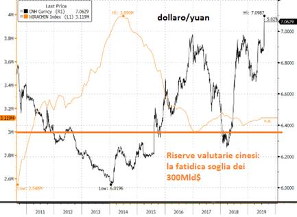 Da queste indicazioni si comprende meglio allora perché mai la Cina ha di fatto deciso la mossa della svalutazione. Non difendere la soglia psicologica di 7 significa in partica lanciare un segnale di sfida agli USA: della serie, caro Trump tu minacci dazi ma sappi che ho la leva del cambio ancora aperta e una parte delle sanzioni posso ancora scaricarle sul mercato valutario, senza depauperare le proprie riserve valutarie sotto i 3000Mld$.