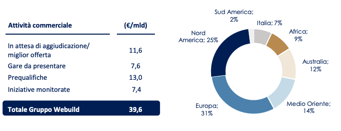Il portafoglio ordini totale risulta pari a € 33,9 miliardi, di cui € 27,4 miliardi relativi alle costruzioni e € 6,3 miliardi alle concessioni. Il totale dei nuovi ordini acquisiti ed in corso di finalizzazione da inizio anno ammonta a circa € 1,9 miliardi. In aggiunta, Webuild risulta come miglior offerente per addizionali € 0,2 miliardi di gare. Nel primo semestre 2020 l’attività commerciale del Gruppo, nonostante il rallentamento del settore dovuto al diffondersi del Covid-19, ha segnato un sostanziale incremento dei volumi di offerte rispetto allo stesso periodo dell’anno precedente. Nei primi mesi dell’anno si è assistito ad un costante slittamento in avanti delle date di gara fino ad un totale ad oggi di ca. € 10 miliardi di opportunità uscite dall’anno in corso e spostate al 2021 (prevalentemente in Europa e Stati Uniti).