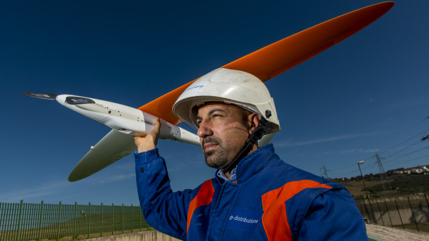 L’azienda sta investendo importanti risorse in questa tecnologia e al momento possiede oltre trenta droni multicottero e un drone ad ala fissa, che possono essere usati dai ventisette piloti, di cui tredici abilitati anche per il pilotaggio del drone ad ala fissa in contesti critici. La differenza sta infatti nell’autonomia: mentre l’ala fissa permette di sorvolare anche centinaia di chilometri di linea per valutare i danni causati da un forte maltempo, i multicotteri vengono invece impiegati soprattutto a vista per salire virtualmente sino in cima ai sostegni e alle cabine di trasformazione e verificare otticamente lo stato dei vari componenti.