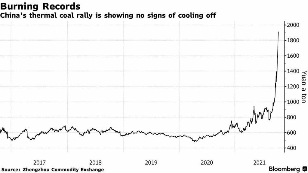 Coal prices are going parabolic in China, with futures climbing 110% since Sep 1 to almost 2,000 yuan per tonne today (~$300). Coal for prompt delivery in the physical market is trading much higher. To put it in context, Newcastle and Richards Bay coal trades ~$230 per tonne pic.twitter.com/hrotNxlv1f