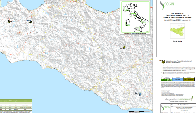 67 aree idonee in 7 regioni. Con il nulla osta del ministero dello Sviluppo e del ministero dell’Ambiente, la società statale Sogin ha ottenuto il via libera alla pubblicazione della Carta nazionale delle aree potenzialmente idonee (Cnapi) ad ospitare il deposito dei rifiuti nucleari.