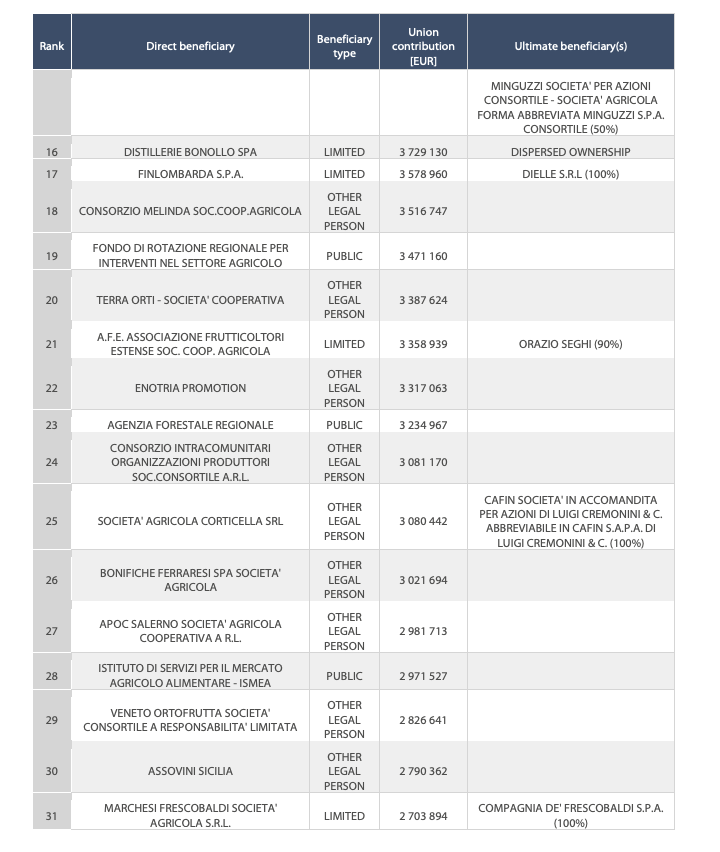 La lista include: 50 persone fisiche che hanno ricevuto più fondi Pac e di coesione nell’Ue, i maggiori beneficiari per ogni Stato membro, i beneficiari finali sia come persone fisiche, sia come entità.