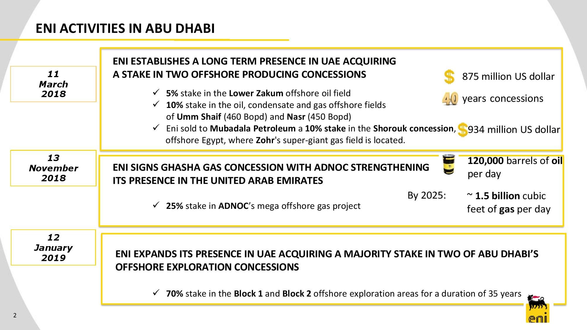 La prima intesa è datata marzo 2018 con l’ingresso ufficiale di Eni negli Emirati Arabi Uniti grazie a due Concession Agreement e una quota del 5% nel giacimento a olio di Lower Zakum e una quota del 10% nei giacimenti a olio, condensati e gas di Umm Shaif e Nasr, nell’offshore del Paese, per 40 anni e un corrispettivo di circa 875 milioni di dollari.