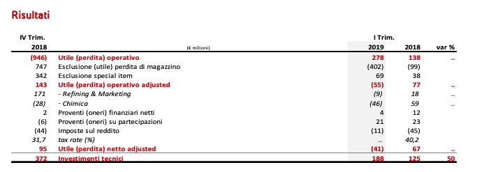 Il tasso di cambio considerato da Eni per il primo trimestre dell’anno è risultato in calo dell’8% a 1,13 dollari per 1 euro, mentre il prezzo del greggio (Brent) è salito del 2% a 55,65 dollari per barile a fronte di un calo del 5% a 63,2 dollari al barile.