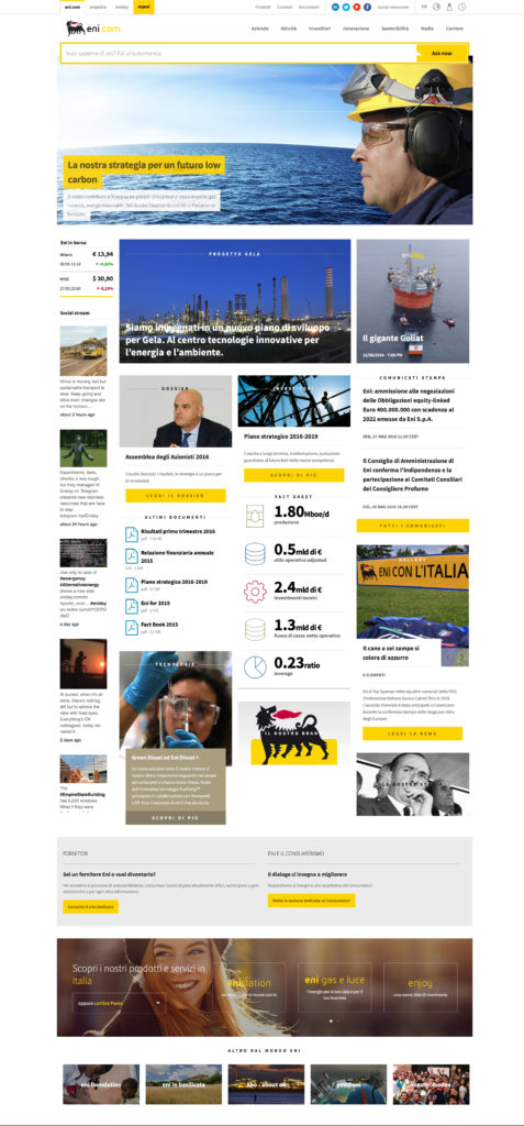 Eni.com è un portale istituzionale che, pur nell’innovazione rispetto al passato, rimane fedele al suo scopo, ossia raccontare l’azienda e i suoi valori, attraverso un albero di navigazione snello e funzionale. Il sito è supportato da una nuova funzionalità, chiamata ask.now, che è un vero e proprio motore di ricerca semantico in grado di rispondere alle domande dei navigatori in modo semplice e sotto forma di racconto.