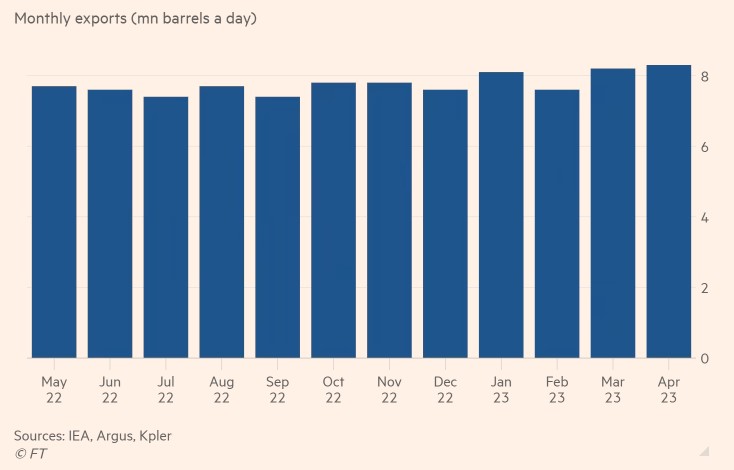 Nello specifico, nell’aprile 2023 la Russia ha esportato 8,3 milioni di barili di petrolio greggio e prodotti raffinati al giorno, un volume decisamente superiore alla media registrata nel 2022 (7,7 milioni al giorno) e nel 2021 (7,5 milioni al giorno). Come nota il Financial Times, questo aumento delle spedizioni è dovuto al fatto che Mosca è riuscita a trovare nuovi acquirenti e nuovi metodi di invio dopo che l’Unione europea – il suo principale mercato di vendita, storicamente – ha vietato le importazioni e il trasporto marittimo dei prodotti petroliferi russi.