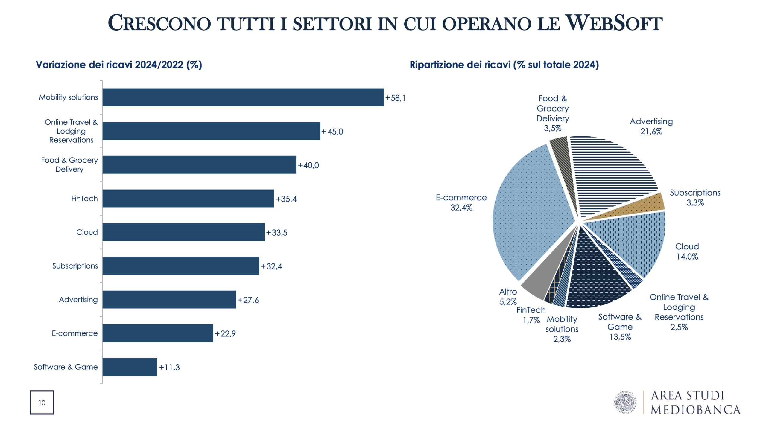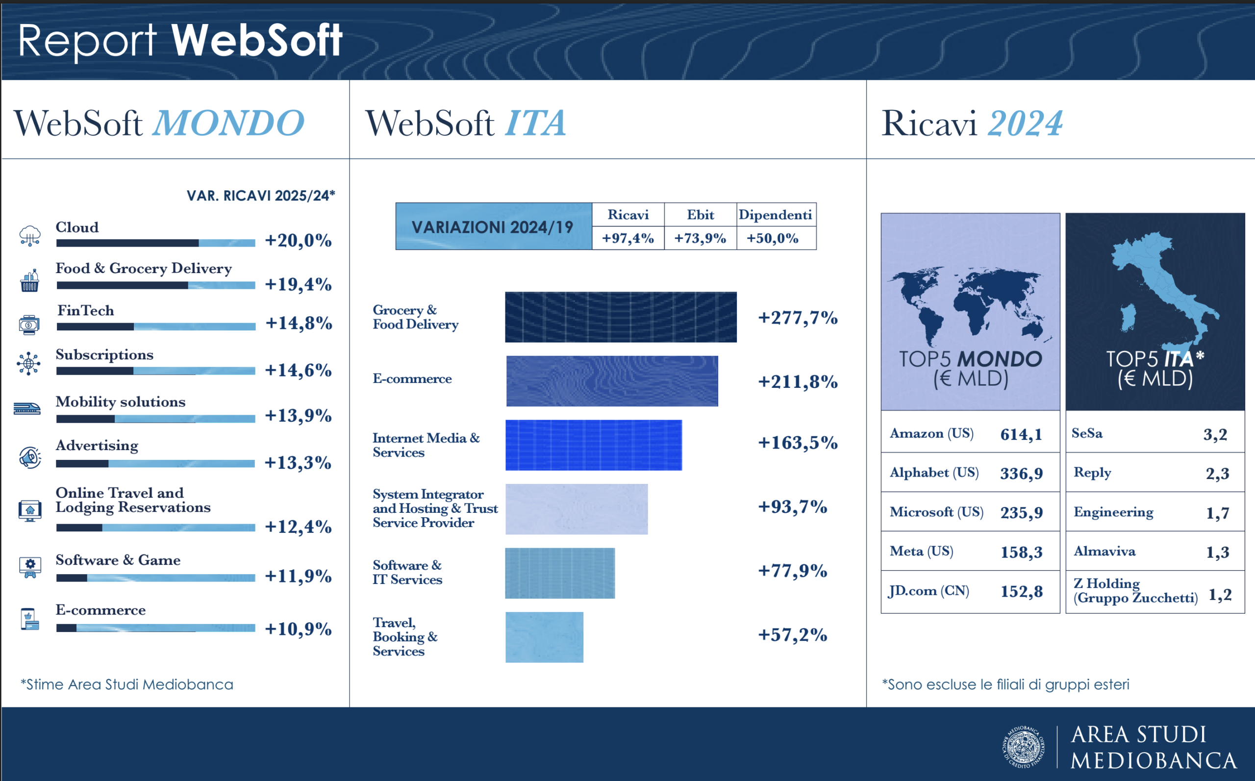 È quanto emerge dal report curato dall’Area Studi Mediobanca sulle Websoft – società attive nello sviluppo software, servizi web e piattaforme digitali – nel quinquennio 2019-2024.