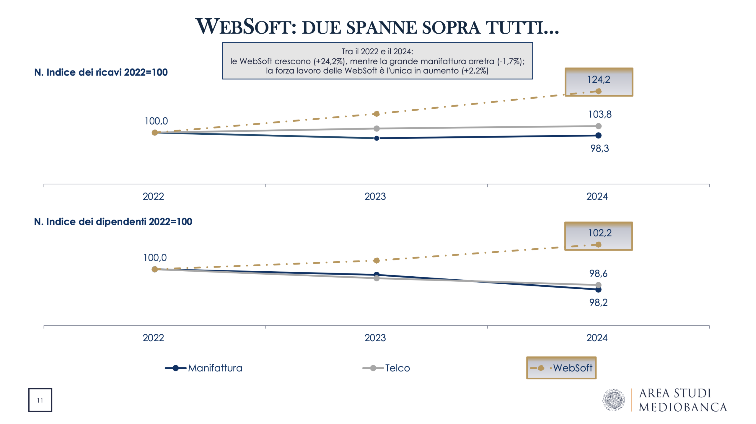Ancora una volta il confronto con la grande industria manifatturiera è evidente: nel 2024 l’utile netto medio giornaliero della manifattura si attesta intorno ai 10 milioni di euro, mentre ogni WebSoft genera oltre 20 milioni di euro al giorno.