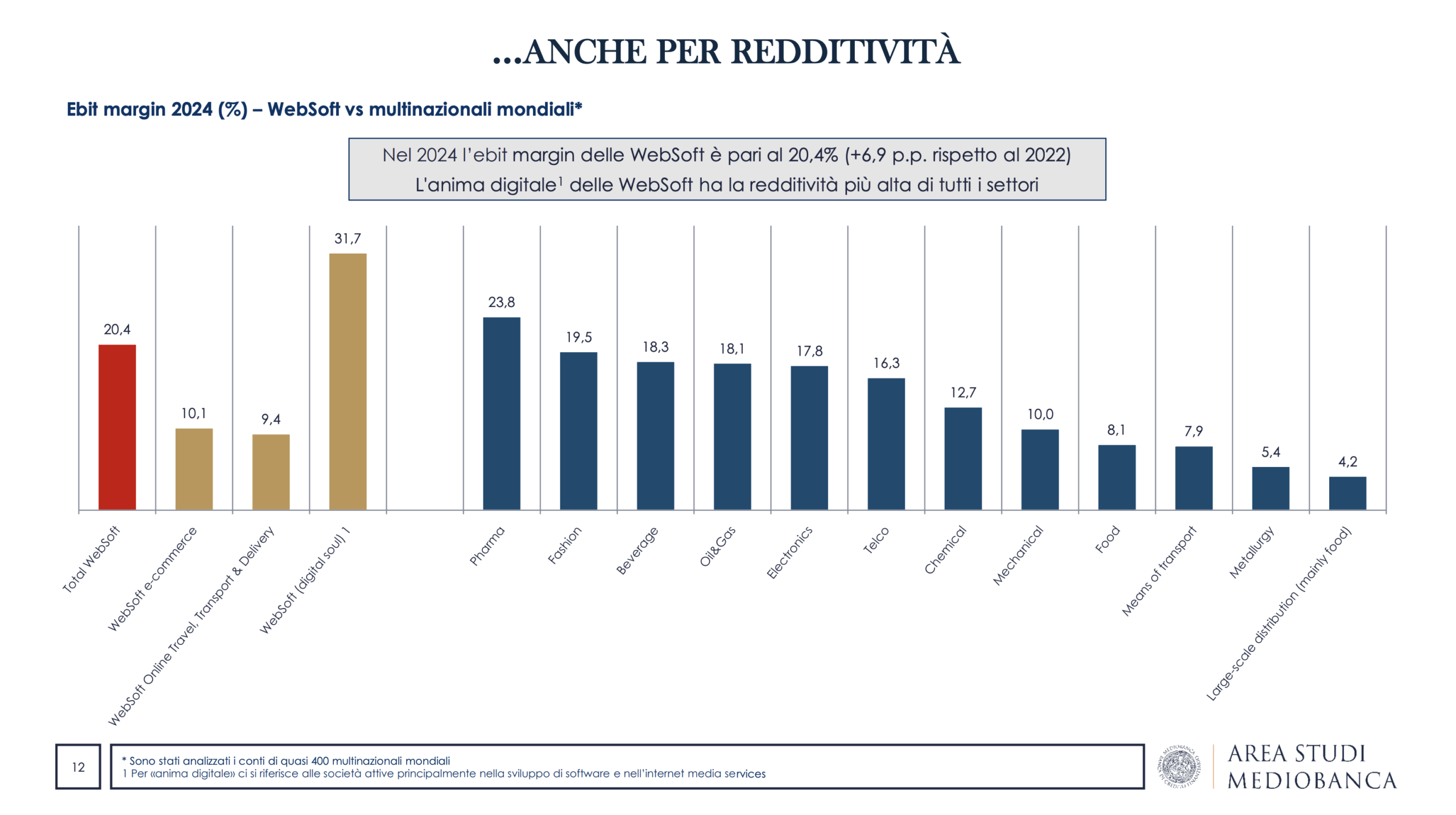 Inoltre, il 2024 si candida ad essere “l’anno dell’efficienza” secondo Mediobanca: le WebSoft mondiali confermano una straordinaria capacità di generare profitti e margini, consolidando la loro posizione ai vertici della redditività globale. L’ebit margin medio si attesta al 20,4%, in forte miglioramento rispetto al 2022 (+6,9 p.p. sul 2022). Ma il dato più indicativo riguarda l’anima digitale del settore (società attive nello sviluppo di software e nell’internet media services), la cui redditività vola al 31,7%, superando tutte le industrie, comprese le case farmaceutiche (23,8%).
