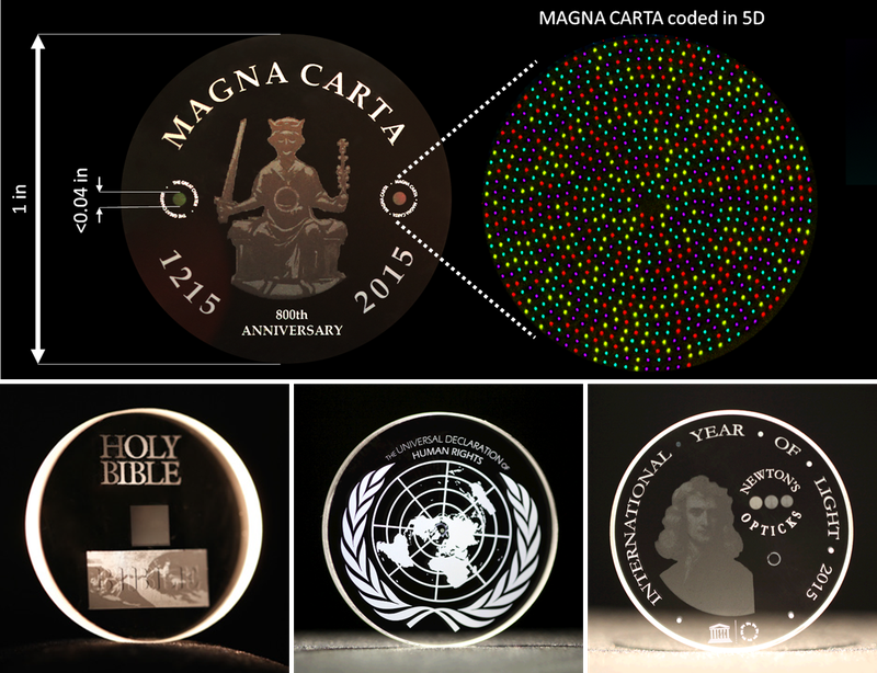 In fase di test, l’ultima versione di 5D data storage ha dimostrato di memorizzare una copia della Bibbia di Re Giacomo (traduzione in inglese per eccellenza della Bibbia), una copia dell’Ottica di Isaac Newton, una copia della Dichiarazione universale dei diritti dell’uomo e una copia celebrativa della Magna Carta (prima costituzione inglese emanata nel 1215). Le informazioni sono conservate all’interno del suo reticolo cristallino (nanogratings nell’originale inglese).