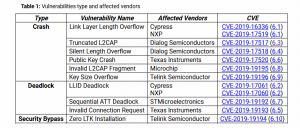 In totale sono una dozzina gli errori rilevati, con il coinvolgimento di oltre 480 dispositivi, tra cui anche FitBit, Samsung e Xiaomi (alcuni esempi dei device più noti nell’immagine riportata sopra). Diversi produttori (Cypress, Dialog Semiconductors, NXP, Microchip, STMicroelectronics, Texas Instruments e Telink Semiconductor), informati delle vulnerabilità, hanno già rilasciato le patch necessarie a risolvere i problemi riscontrati e denunciati dagli esperti della Singapore University of Technology and Design.