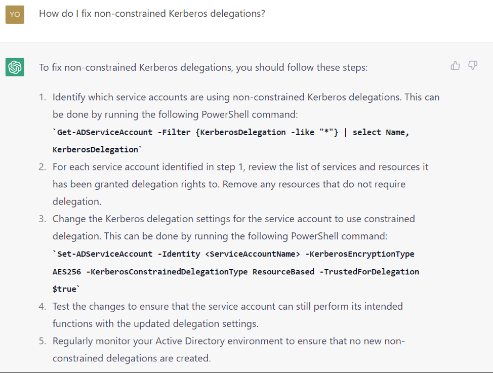 La conversazione nelle Figure 8, 9 e 10 mostra come un addetto alla difesa può usare ChatGPT per identificare e limitare i rischi associati alle deleghe Kerberos non vincolate. Se non sai cos’è una delega Kerberos non vincolata, chiedilo a ChatGPT.