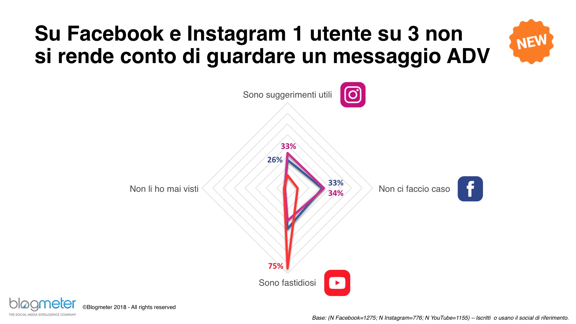 Gli annunci pubblicitari su Facebook e Instagram sono considerati utili come fonte di stimoli rispettivamente per il 26% e il 33% degli intervistati. In realtà Blogmeter pone l’accento su come molti utilizzatori tendano a non distinguere l’advertising dai contenuti organici su questi social (ciò vale per 1 intervistato su 3). Molto più critica la percezione della pubblicità su YouTube, considerato fastidioso dal 75% degli intervistati. Anche nel 2018 l’E-commerce si conferma fortemente correlato all’uso dei social: coloro che acquistano più frequentemente online sono tra i più frequenti utilizzatori dei social network. Rispetto all’anno passato cresce la quota di utenti che dichiara di acquistare cosmetici e prodotti per la persona (+6%), prodotti per animali domestici (+4%), pasti consegnati a domicilio (+3%) e articoli per bambini (+3%). Dallo studio emerge che quello dell’e-commerce è un settore destinato a crescere: il 50% degli intervistati ritiene che incrementerà i propri acquisti online nell’anno a venire.